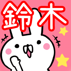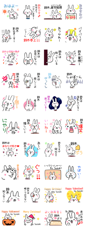 鈴木(すずき/スズキ)さん用の、可愛いウサギのゆるい名前スタンプ。イベント用挨拶(誕生日,クリスマス,ハロウィン,年賀状,バレンタイン等)も入れてます♪送ると面白い♪むらびと【名前・アダ名のスタンプ&着せかえ制作】 より発売