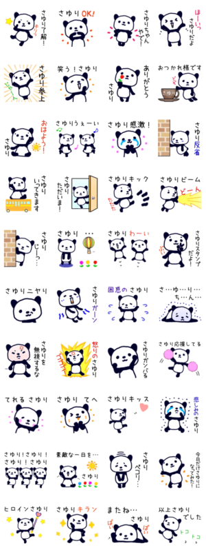 パンダのサユリさんスタンプです。小百合さん、沙由里さん、早百合さん、紗由理さん、まだまだ沢山のさゆりさんへ。宜しければ使ってみて下さい。よろしくお願いします。ペコリ より発売