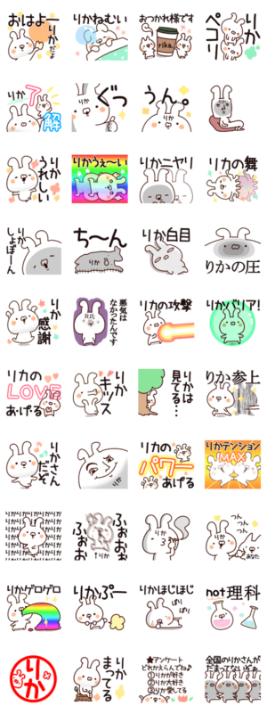 りか、ちゃん、さん、が使える/ゆるい名前/あだ名スタンプ。リカ/りかこ/まりか/えりか/りかな/梨花/里香/理香/梨華/梨香/里佳/里花/専用1かわいい、うさぎ/山田まぽん作山田まぽん/名前スタンプ より発売