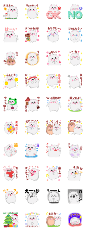 かわいい白ポメラニアンのスタンプです。日常会話でよく使う言葉を集めてみました。クリスマスやお正月に使えるスタンプもあります。