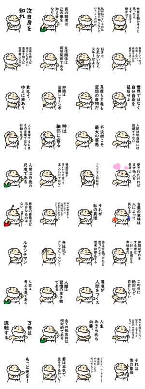 ニーチェ、デカルト、カント、サルトル、ヘーゲルなど、哲人・賢人の言葉や名言、哲学用語をスタンプにしました。仕事や恋愛、人生についての金言がそろっています。ZUN より発売