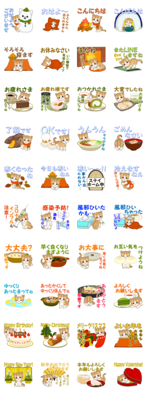 茶トラ白の子猫がこたつや暖炉で。鍋・おでん・シチュー・焼芋・お餅・汁粉・抹茶ケーキ等の冬の味覚を優しい言葉に添えて。クリスマス・お正月・バレンタインデーにも。つのっち より発売