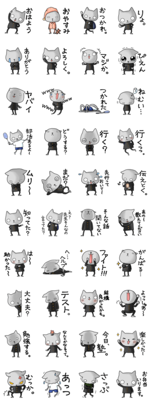 中学生・高校生の為の学校生活で使えるスタンプです。学生服を着た猫さんがあなたの気持ちを代弁します。shibocchi より発売
