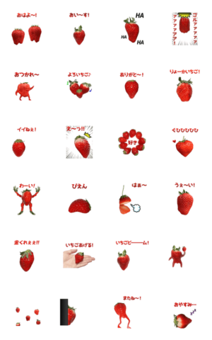 イチゴの写真で作った動くスタンプです。かわいい苺がキモ可愛く激しくぬるぬる動きまくります。いちご、フルーツ、ストロベリー、果物。実写食べ物スタンプシリーズ。竹野チコ より発売