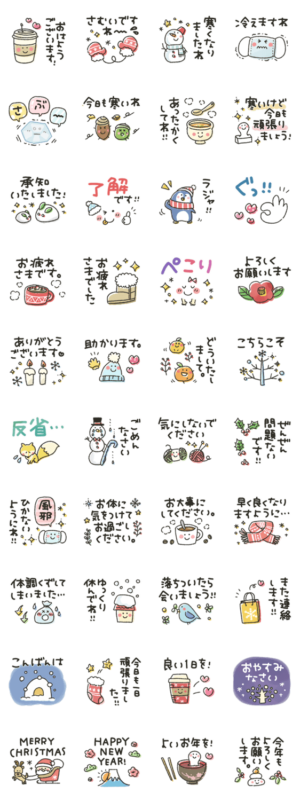 キャラ無しのシンプルスタンプ冬バージョン!寒い冬に家族や友人を気遣う言葉がたくさん。クリスマス、年末年始、お正月にもどうぞ。