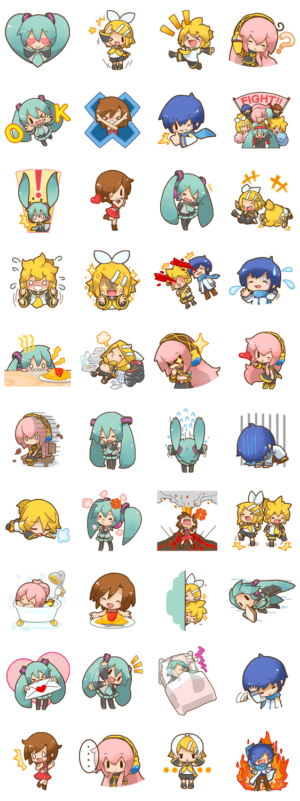 大好評の初音ミクスタンプ第二弾が登場!今回はミクを始めリン・レン、ルカ、メイコ、カイトとキャラクターが大集合!イラストレーター「三月八日」さん書きおろしです!