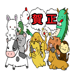 ねずみ、牛、とら、うさぎ、辰、へび、馬、羊、猿、鳥、犬、いのししの全十二支をスタンプに。年末年始、正月に毎年使える干支。あけましておめでとう。今年もよろしく。猪