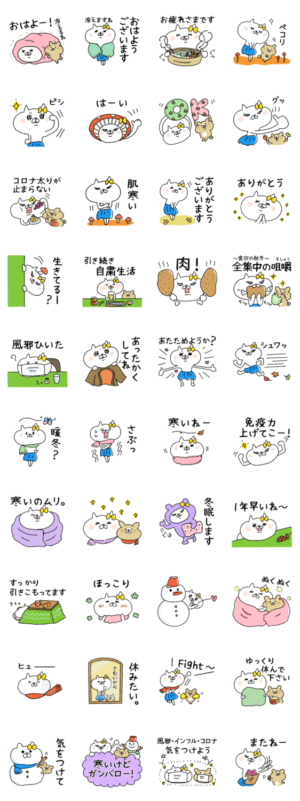 女子力高めな白猫、ネコ子の秋冬スタンプです。何かと大変な年になってしまったけど、いつも心は前向きに!なかなか会えない人にもLINEスタンプ送って楽しくトークしよ♡OTOBOOK より発売