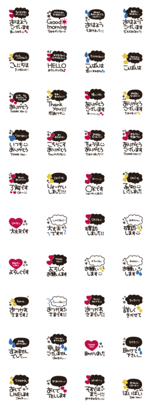 よく使うフレーズ、あいさつをスタンプにしました!これひとつで会話ができます! あいさつ/便利/使いやすい/ハート/癖字/女の子/敬語/手書き/吹き出し/くすみカラー/BIG ※このスタンプはトークルームで大きく表示されるBIGスタンプです。hitonatsu より発売