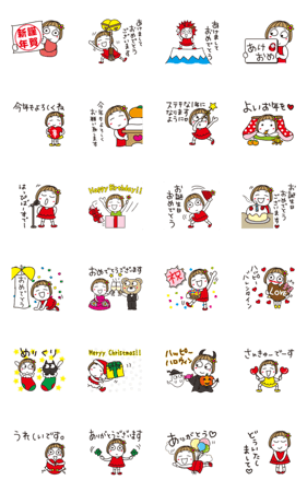 正月、年賀状、クリスマス、バレンタイン、誕生日、ハロウィンのイベント他おめでとうなどお祝いでも使えるイベントスタンプ。ありがとうなどの返信用もセットしました。キキぷり より発売