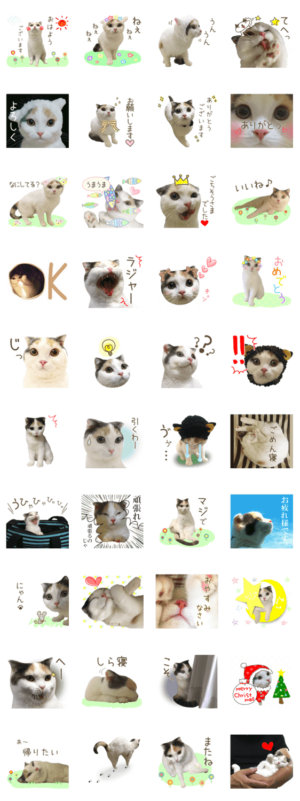 スコティッシュフォールドのむぎを、スタンプにしました。写真を使った40種類の実写ねこ。冬のイベント、クリスマス入り!我が家のアイドル猫デカ文字実写スタンプ