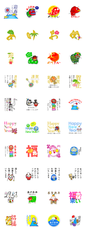 新年・年賀・お正月などをイメージしたイラストの“あけましておめでとう”年賀状あけおめメールスタンプです。ビジネス用や先輩にも送信できるスタンプも入っています。つましよ より発売
