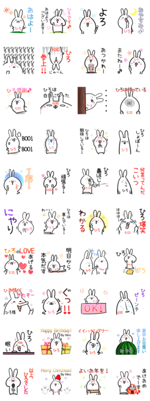 ヒロちゃん/さん用の可愛いウサギのゆるいなまえ/あだ名スタンプ。弘/宏/浩/寛/紘/比呂/尋/ひろし/ひろこ/ひろみ/ひろゆき/ひろき/ひろえ等の名前の方専用で送ると面白い♪むらびと【名前・アダ名のスタンプ&着せかえ制作】 より発売