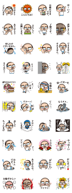 パンツとランニングのおじさんのスタンプです。昭和の香りただよう死語や、使いやすい言葉・敬語をセットにしました。