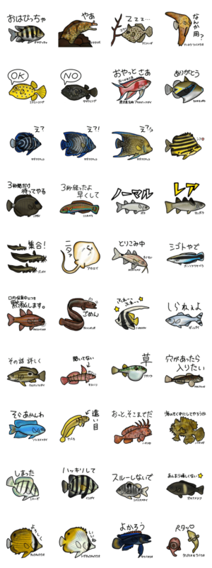 磯や漁港での採集でおなじみの海水魚を集めました!日淡や熱帯魚に負けない魅力のある近海魚。可愛い死滅回遊魚から誰得な普通種まで、まさかのLINEスタンプになって登場!