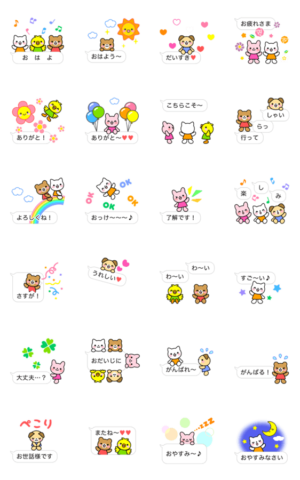 上下・左右・回る・飛び出す、動く♪ 吹き出し と、ネコ・クマ・イヌ・ウサギ・ヒヨコ の、やさしい可愛い毎日使える基本スタンプです。