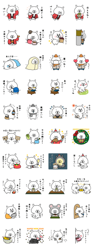 ゆるうさぎの冬スタンプ第4弾!家族や友達、彼氏彼女との日常のトークにどうぞ。クリスマス、年末、年越し、正月、節分、バレンタインなど冬のイベントにも使えます。chococo より発売