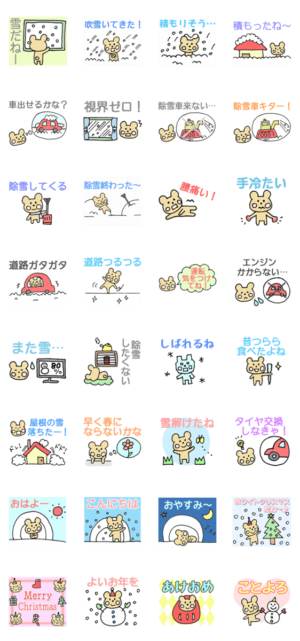 雪国でよくある、大雪、吹雪、除雪、道路、車など、冬に使えるかわいいクマさんのスタンプです。年末年始の挨拶。メリークリスマス、お正月のあけおめ、ことよろ付きです。eko より発売