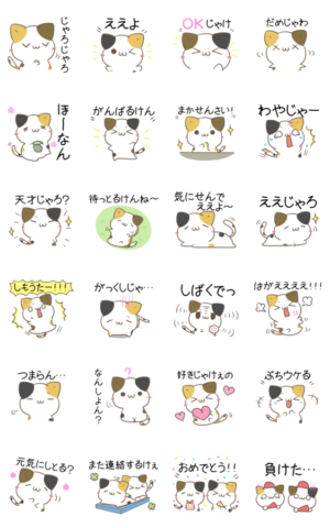 毎日使える広島弁を話す野球好きな三毛猫のミケ達のシンプルで可愛いスタンプ第3弾!パンダverも販売中!山口・岡山・島根・鳥取の方にもつきしろ より発売