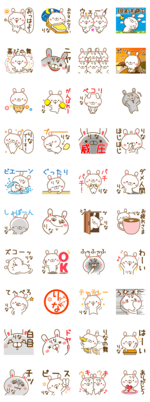 りなちゃんが使える名前スタンプです。えりな、まりな、ゆりな、りなこ、さりな、里奈、理奈、莉奈、梨奈、莉那、里菜、全国のりなが付く人専用のスタンプです