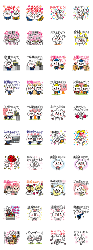 卒業や就職など、いろんなおめでとうが詰まっている、嬉しいスタンプです。