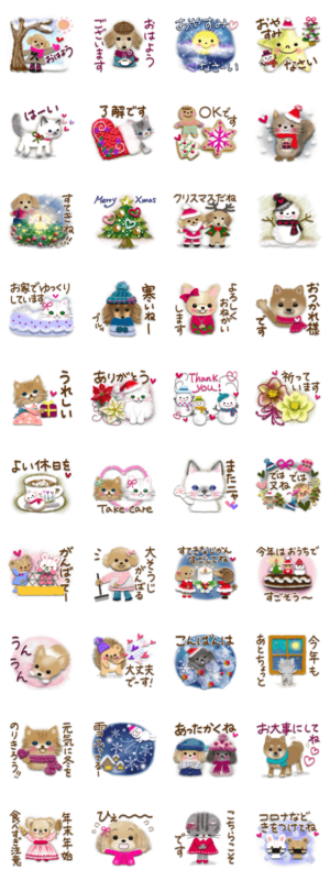 クリスマスや冬の季節に使えるスタンプです。寒い時期も、ほっこりあったかくなりますように。会話の最後や、いろいろ使える絵だけのスタンプも入っています。メルテュード より発売
