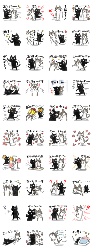 黒猫ナノとキジシロ猫きなこ。友達や家族によく使うはずのスタンプ。ぱるぱ-る より発売