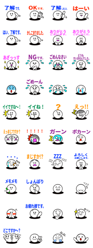 大人の男性、女性でも使いやすく、仕事などでも使える敬語。顔文字をベースに使いたい、表情ポーズ、言葉をチョイス。シンプルさに特にこだわった。これひとつでOK。あんじープロジェクト より発売