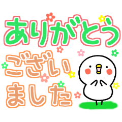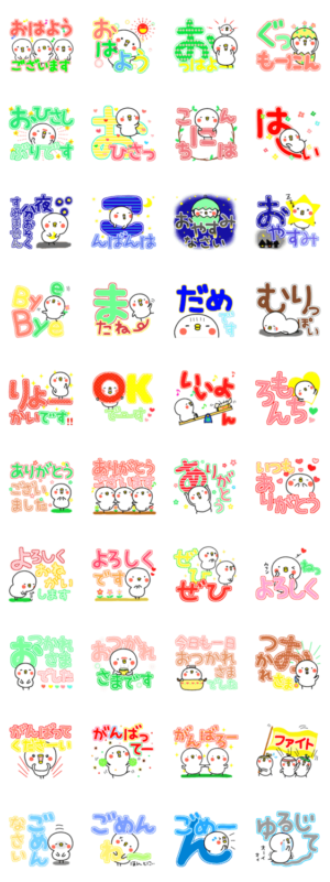 白くて丸いトリとカラフル超デカ文字。 おはようからおやすみ、ありがとう、おつかれなどよく使うあいさつ言葉入り。敬語もあるので年上の方にも使えます。(リメイク版)デコスケ より発売