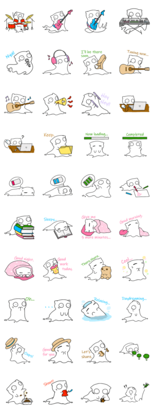 大きな目が特徴のとろとろとした不思議な猫、Siropus Cat(しろっぷねこ)のスタンプ第2弾です。バンドを組んで楽器を演奏したり、読書をして寝落ちたり…。※英語版