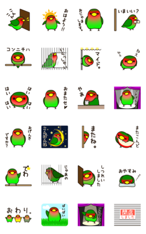 コザクラインコの動くスタンプ、会話の最初と締めのあいさつ用セリフ付きです。鳥好き・インコらぶのかたへ。