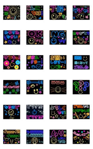 挨拶(おはよう・こんにちは・おやすみなさい・お疲れさま)や返事(OK・了解です)など毎日使う基本セット♪カラフルなネオンと笑顔がいっぱいの楽しい動くスタンプです♪