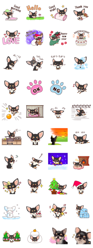 かわいいチワワ(ブラックタン)のスタンプを日常でよく使う言葉を集めた冬編になります。上司やお客様やお友達など色々な方々にも使いやすいスタンプになっています。