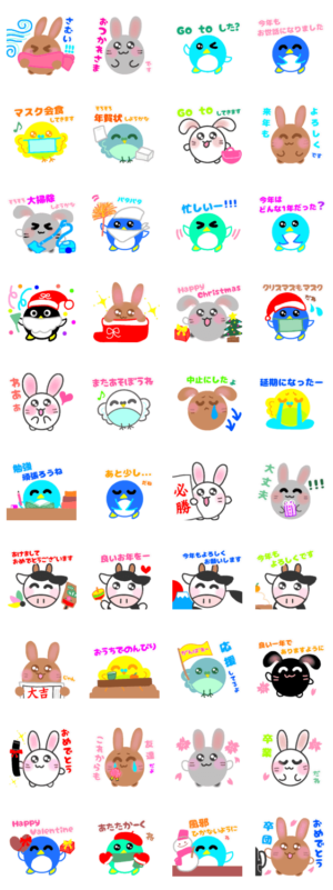 カラフルなうさぎ、ペンギン、インコ、ウシのスタンプです♪年末年始、クリスマス、卒業式、お正月、大掃除、年賀状作り、受験、卒団、バレンタインなどに使ってください。