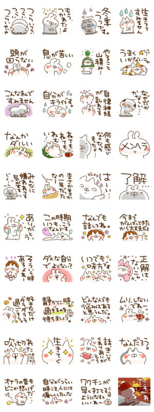 ねことうさぎの名前スタンプシリーズ。元気がない、ねこうさです。励まし入り。ネガティブ/メンヘラ/虚無/辛い/鬱/愚痴/病み/冬季うつ/五月病。山田まぽん作山田まぽん/名前スタンプ より発売