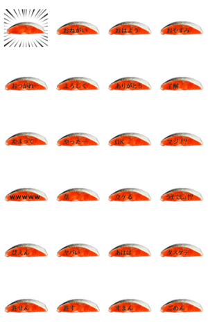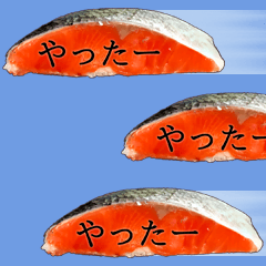 トークの後ろに鮭の切り身が流れるシンプルなスタンプです。日常に使える言葉多め。鮭が好きな方、鮭が食べたくなったときにどうぞよろしくお願いします。めでたい⭐︎あつかまくん より発売
