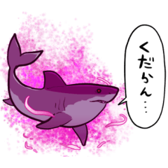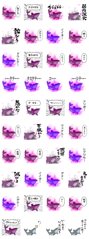 闇落ちした鮫のスタンプです。鮫島さんとか鮫川さんとかなんかつらい事があった方とか中二病の方とかにどうぞ。普通のサメのスタンプもあります。オカヤマ より発売