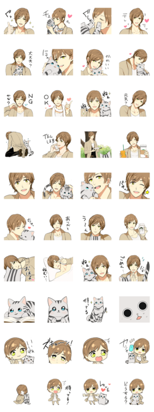 ねこのきもち『ねこと僕』スタンプです!アメリカンショートヘアのグレー猫と、キラキラ男子のキュンキュンくるスタンプです。(スタンプデザイン:緒山千)