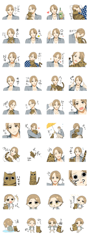 ねこのきもち『ねこと僕』スタンプです!MIXキジトラ猫とほんわかゆるふわ癒し系男子のスタンプです♪(スタンプデザイン:緒山千)