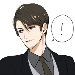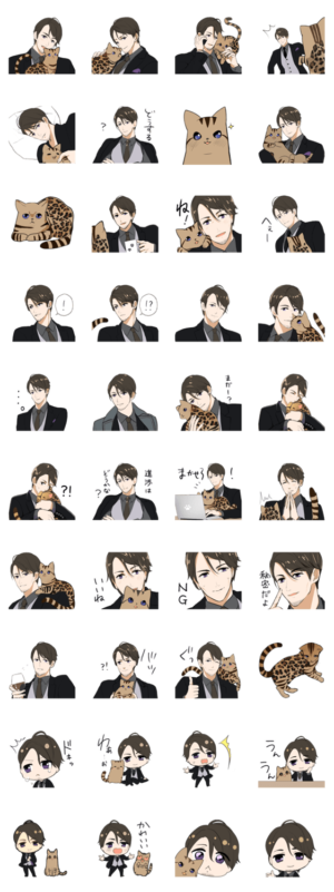 ねこのきもち『ねこと僕』スタンプです!ヒョウ柄猫と、スーツが似合うオヤジ系イケメンの仲睦まじいスタンプです♪(スタンプデザイン:緒山千)
