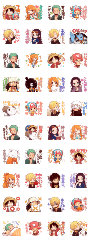 ワンピースの毎日使える丁寧な敬語スタンプです。ルフィ、ゾロ、サンジ、ナミ、ウソップ、ロビン、ブルック、ジンベェ、ロー等、リアクションや挨拶が沢山はいっています。