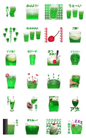 メロンソーダのエフェクトスタンプです。背景で動くメロンソーダはインパクト抜群♪ソーダ、ジュース、サイダー、炭酸飲料、写真。実写飲み物スタンプシリーズ。竹野チコ より発売