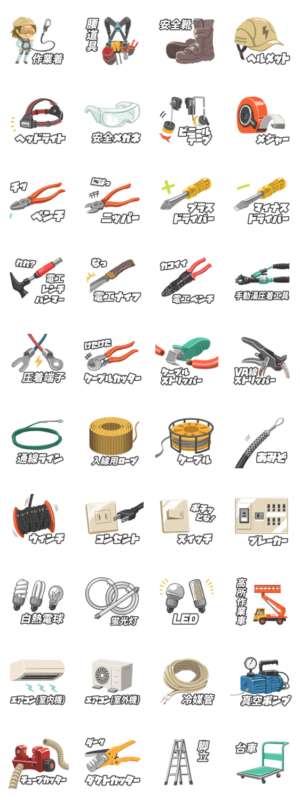 このスタンプは、仲良し電気工のご家族が、工具のやりとりをするときに使うことを想定して作りました。家族に限らず、仲間うちで気楽にお使いいただけると幸いです!