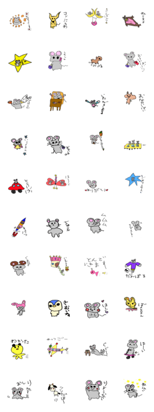 ねずみのちゅーちゃんの可愛い日常スタンプです。5歳児ならではの絵のバランスにほっこりしつつなんか笑えちゃう。トラ、ペンギン、キツネ、いぬ等楽しい動物もいっぱい。