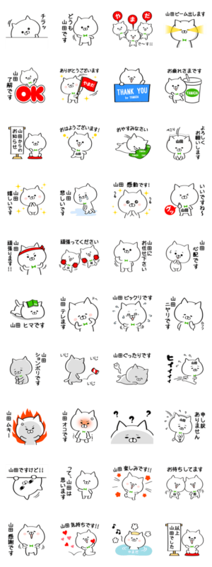 名字(苗字)山田(やまだ)さんが使うネコの名前スタンプです。仕事仲間にも使えるように敬語・ですます調になっています。40個スタンプです。