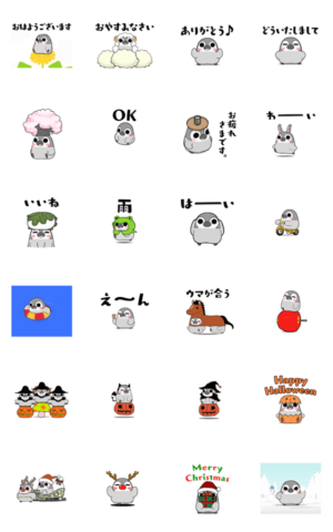 ペンギンに似た生き物、ぺそぎんのセリフ付き動くスタンプです。お花見、夏休み、ハロウィン、クリスマスといった季節のスタンプも入っています。