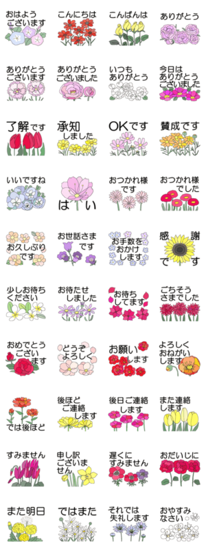 シンプルで見やすい、よく使う基本敬語の便利なデカ文字スタンプ。春のような大人カワイイ花たちで気持ちを伝えます。Konko3 より発売