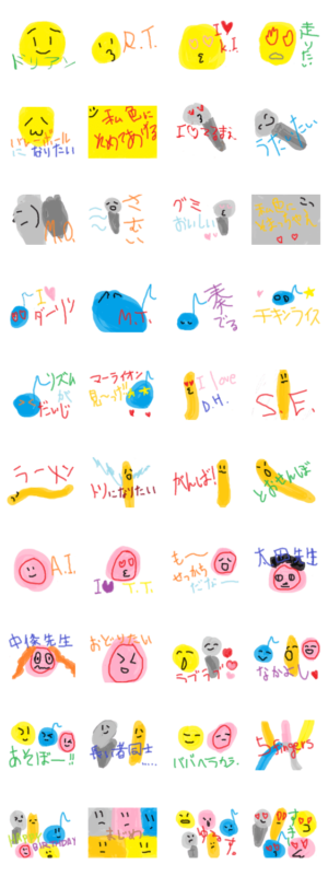 とってもかわいいお友達集団、チーム安藤。 そして、とっても謎なのである。謎な人用のスタンプ。 お皿、ラーメン、マイク、音符、そして黄色い玉というメンバーから成る。