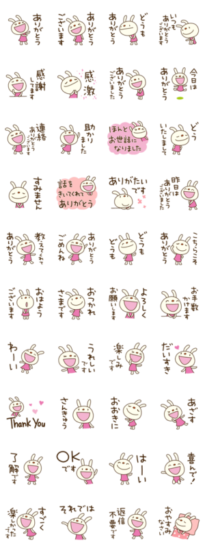 てるてるうさぎ。ありがとうを伝える編。「助かりました」「どうもありがとう」から「今日はありがとう」まで。てるてるうさぎで、心こもったありがとうを届けよう。