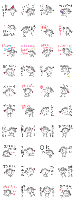 くるリボン。おめでとう編。「誕生日おめでとう」「カンパーイ」から「祝」まで。お祝いで使いやすい言葉がいっぱい。くるリボンで、おめでとうをたくさんを届けよう♪Mami / エストループ より発売